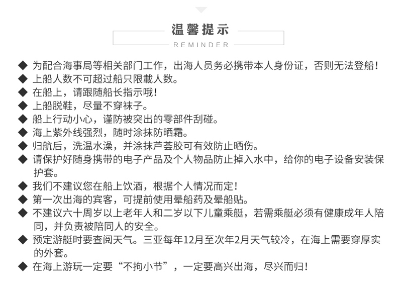按出海人數(shù)提供,讓出海玩得更盡興,建議盡量在游艇出海前1個小時貼上;